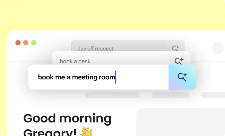 Simplify workflows with an intelligent assistant that helps employees find and book desks, meeting rooms, and parking, with proactive suggestiions based on habits and colleague presence.