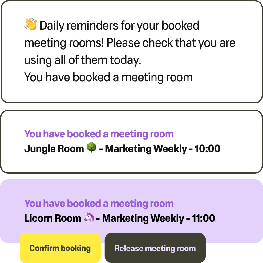Prompt users to confirm or release rooms before meetings start, freeing space early.