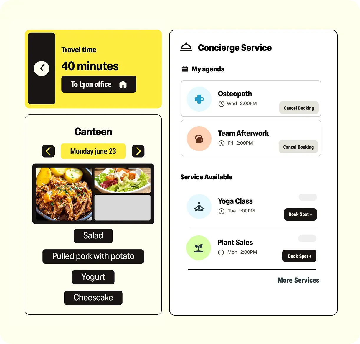 Conciergerie and marketplace: Access a localized catalog of personal site services, from dry cleaning to local pop-up vendors, in one central location.
